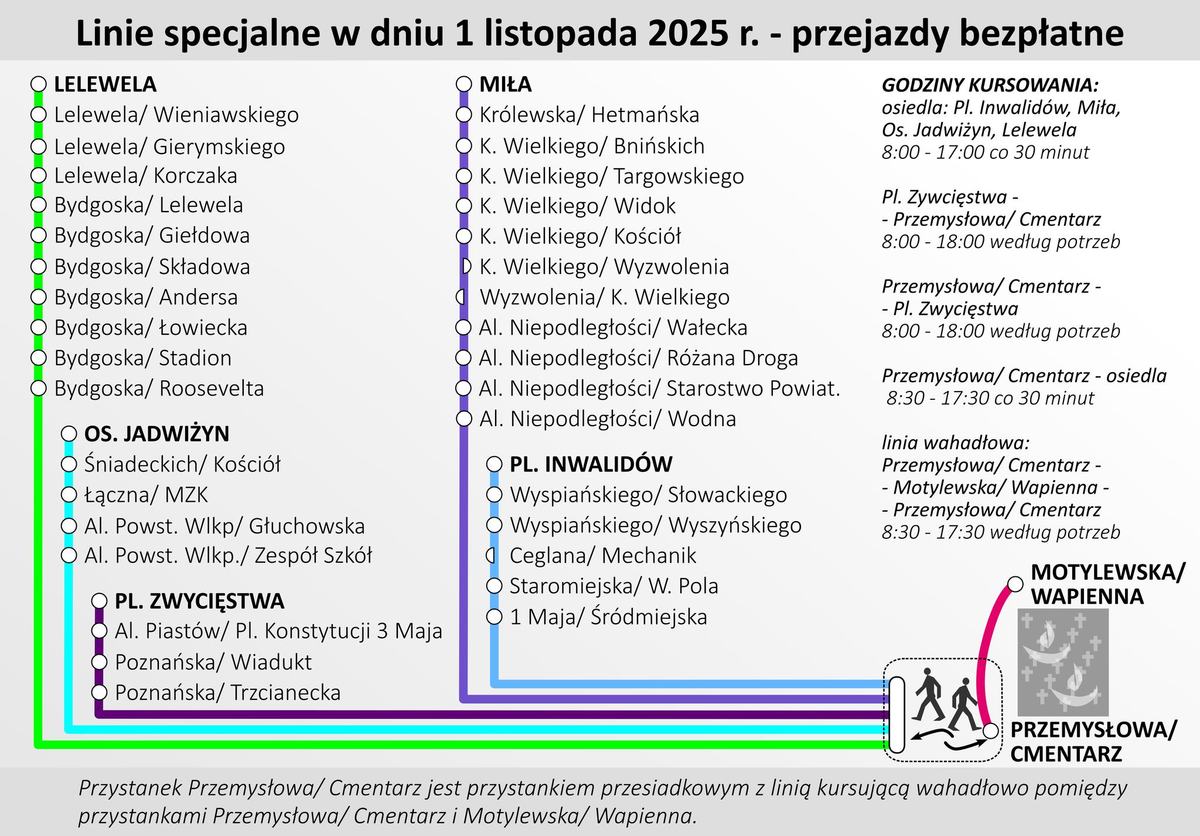 Zachęcamy również do skorzystania z bezpłatnych przejazdów liniami specjalnymi pilskiej komunikacji miejskiej. To rozwiązanie pozwoli nie tylko bezpiecznie dotrzeć na teren cmentarza, ale również zaoszczędzić czas. Poniżej prezentujemy rozkład jazdy autobusów specjalnych: