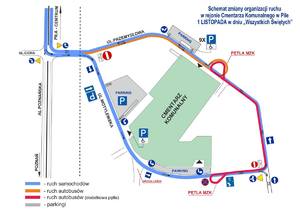 W dzień Wszystkich Świętych, podobnie jak w latach ubiegłych, nastąpi zmiana organizacji ruchu. Dojazd do cmentarza będzie możliwy z dwóch stron – od alei Poznańskiej oraz od strony obwodnicy przy ul. Przemysłowej. Należy jednak pamiętać, że zarówno na ulicy Motylewskiej, jak i Przemysłowej obowiązuje ruch jednokierunkowy dla samochodów osobowych. Wyjątek stanowią autobusy komunikacji miejskiej, które na ulicy Przemysłowej oraz fragmencie ulicy Motylewskiej oraz będą mogły kursować w obie strony. Będą to autobusy przywożące pasażerów z miasta pod bramę cmentarza przy ul Przemysłowej oraz kursujące pomiędzy pętlami przy Przemysłowej oraz Motylewskiej.