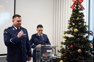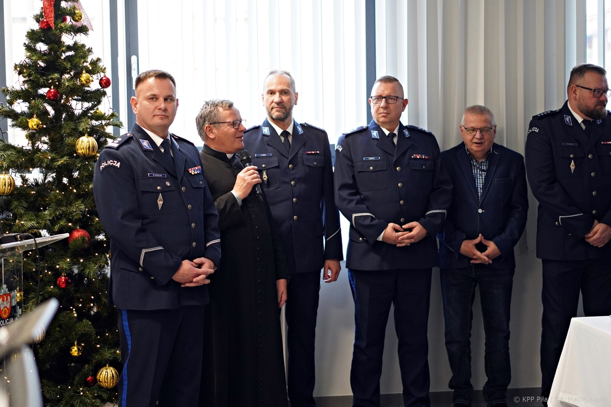 Swoją obecnością zaszczycił również kapelan pilskich policjantów ks. Krzysztof Kowal, który w wyjątkowy sposób zwrócił do wszystkich obecnych, składając tym samym świateczne życzenia. Całości świątecznej i podniosłej atmosfery dopełniła nuta kolędy grana na żywo przez policjantów pilskiej jednostki.